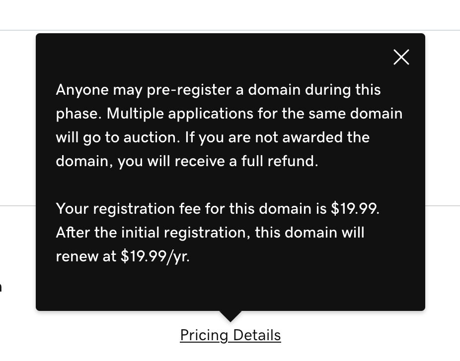 Anyone may pre-register a domain during this phase. Multiple applications for the same domain will go to auction. If you are not awarded the domain, you will receive a full refund.